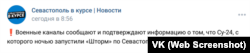«Нормальный такой бах. Работает ПВО», – говорится в сообщении группы «Северная сторона Севастополь» соцсети «Вконтакте».
